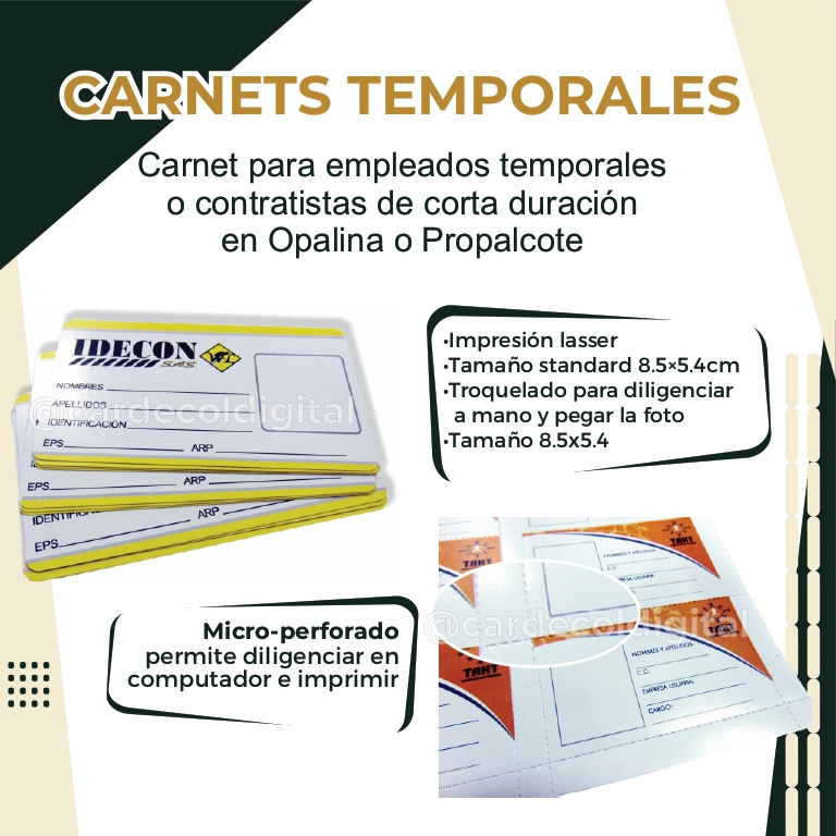 Carnets para empleados temporales o contratistas, impresión láser full color sobre papel flexible, para diligenciar a mano, opcional pegar foto.