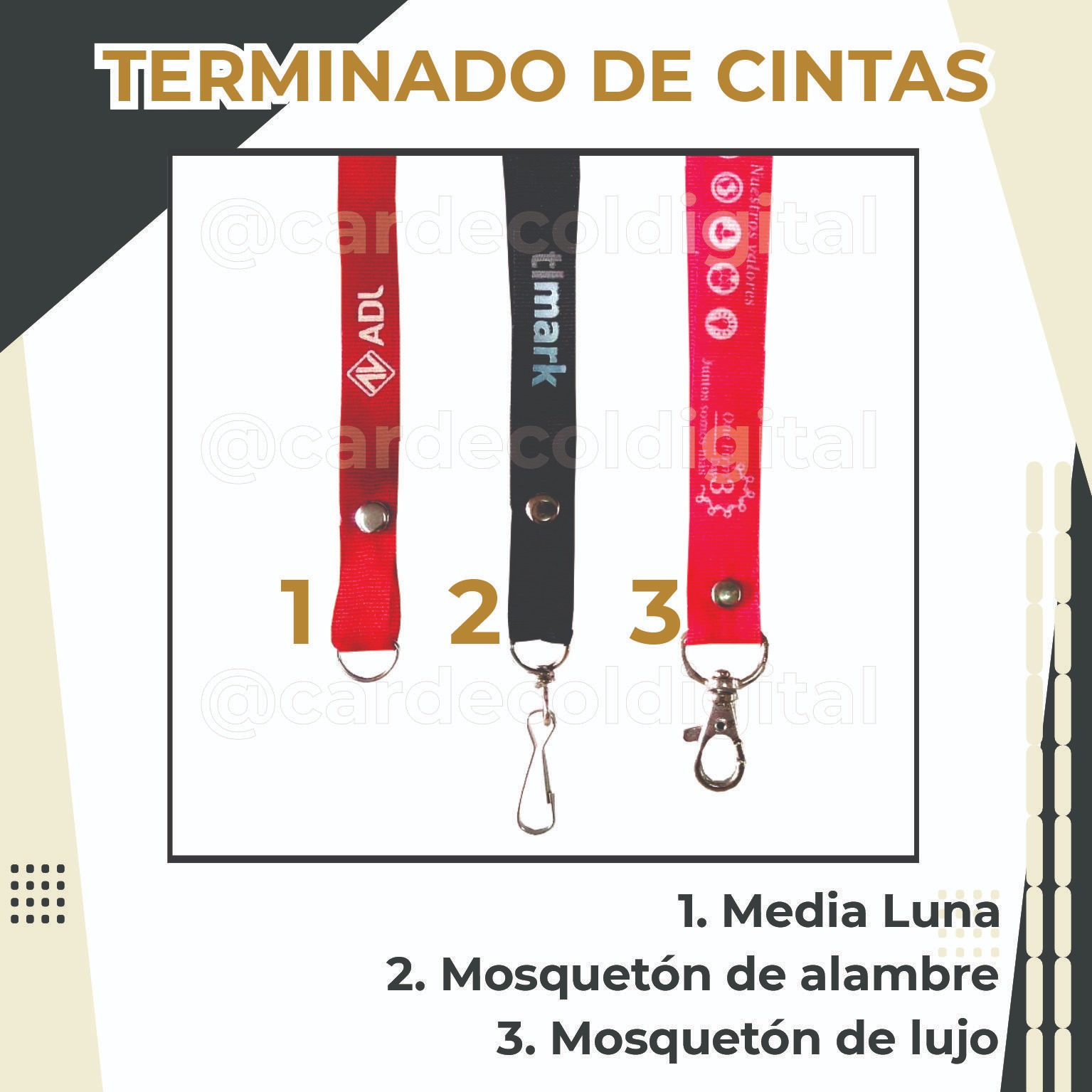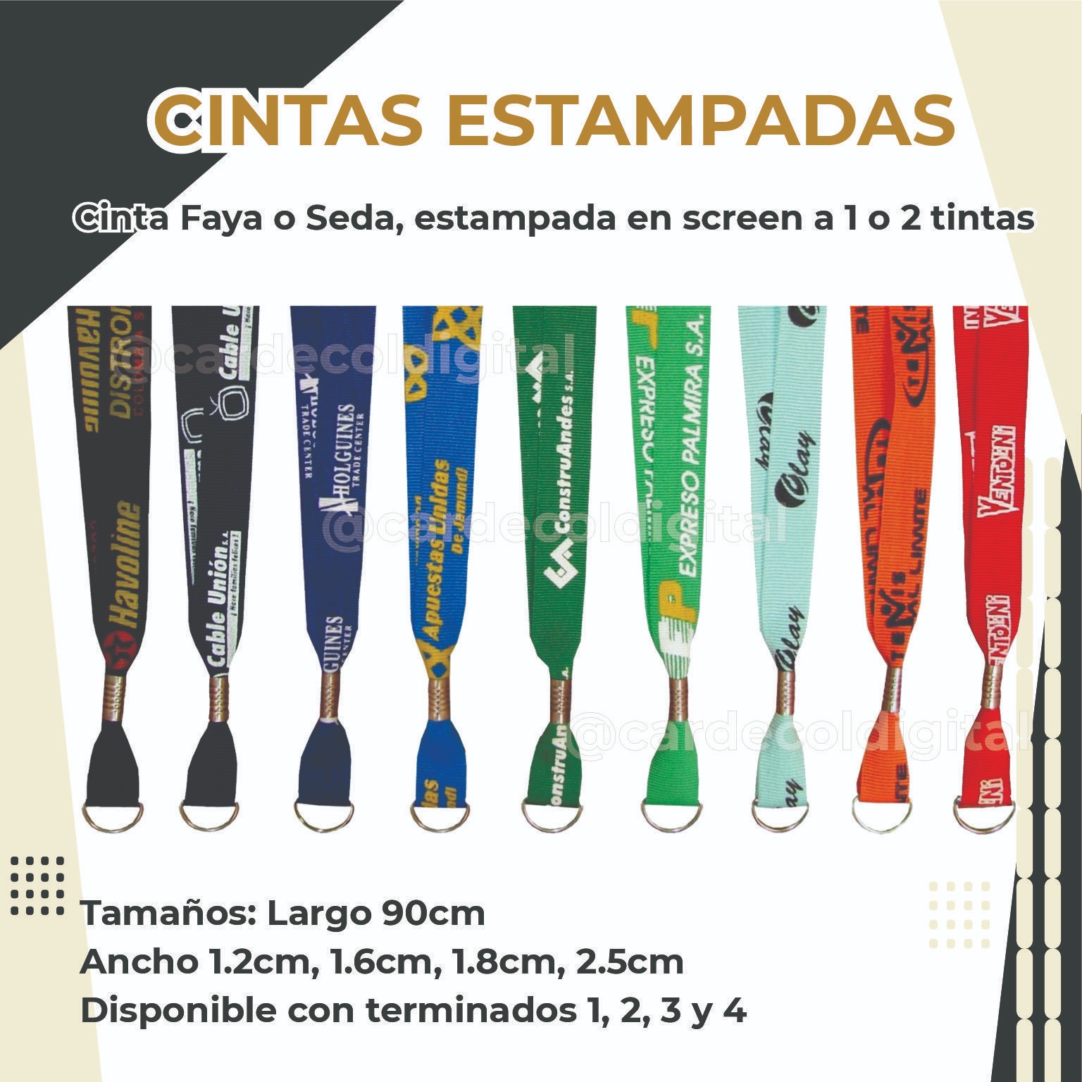 Cinta Faya o seda para colgar en el cuello, estampada en screen a 1 o 2 tintas con el logotipo de la empresa. Variedad de colores básicos. Ideal en proyectos de carnetización de varias personas por su economía.